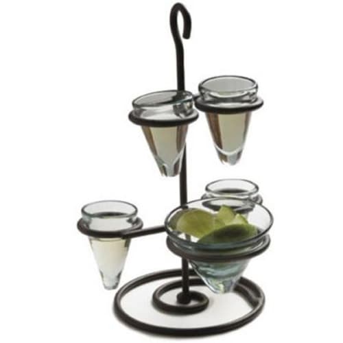 This Orion Trading Flight Caddie is a great way to serve tequila shots. It is made from iron, and includes four 1.5 Oz. cone shot glasses and one 4 Oz. citrus cone bowl.
