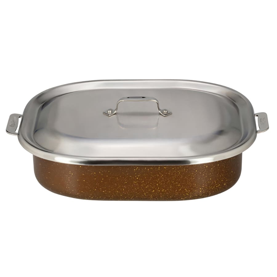 This 7 quart Cucina French Oven from Bon Chef is part of the HotStone Collection and can be used in steam tables, on induction stoves and be placed in ovens (up to 400°F). The square handles make it easy to carry and it includes a lid.