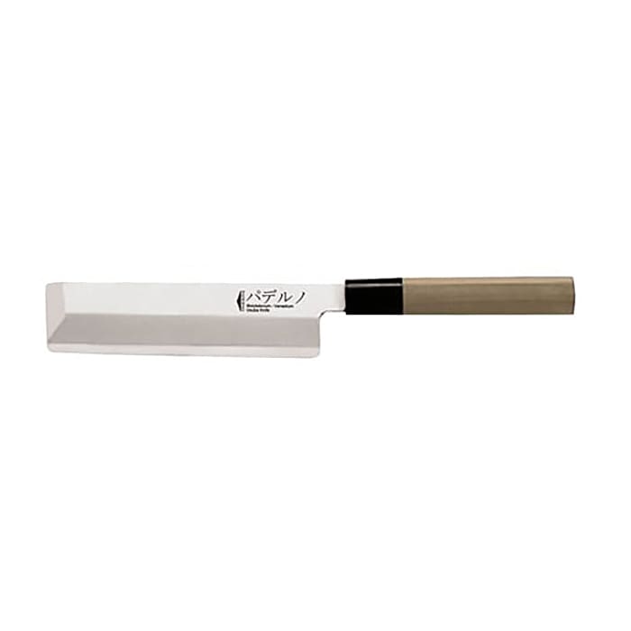 This Paderno® World Cuisine Usuba Japanese Sushi Knife has a thin, double-bevel blade that is ideal for chopping and dicing onions, potatoes, and more. It has a slip-resistant wooden handle and is a 7.13 length.