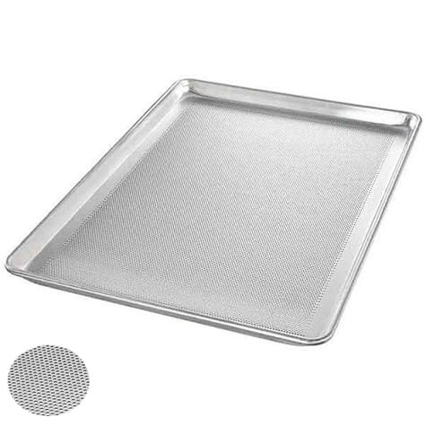 Constructed of 18 gauge aluminum with a wire in rim and .125" diameter bottom perforations, this StayFlat® Sheet Pan is a full-size, commercial-grade baking pan engineered for durability and precision. The StayFlat® technology increases pan strength and longevity through sidewalls that are continuously reinforced with a horizontal engineered rib. This pan’s overall size is 25-13/16" x 17-7/8" x 1".