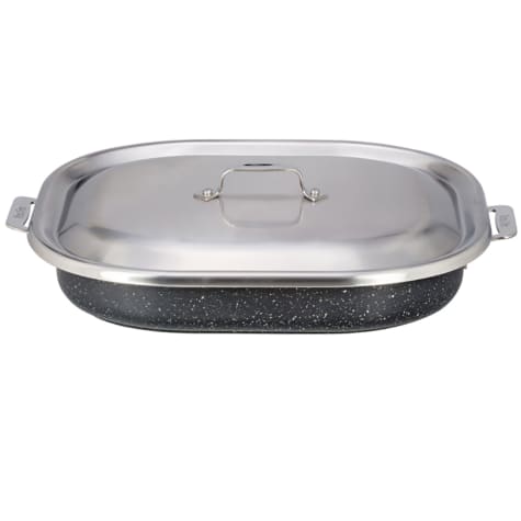 This 5 quart Cucina oblong pan from Bon Chef is part of the HotStone Collection and can be used in steam tables, on induction stoves and be placed in ovens (up to 400°F). The square handles make it easy to carry and it includes a lid.