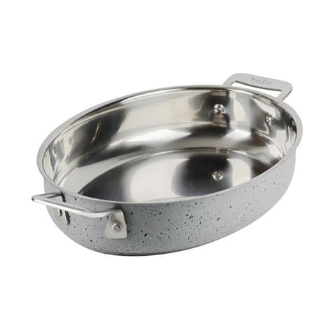 This oval au gratin dish from Bon Chef is perfect for banquet or buffet presentations. It can be used in steam tables, on induction stoves and be placed in ovens, up to 400°F. This dish features durable stainless steel construction with two handles and is great for display cooking.