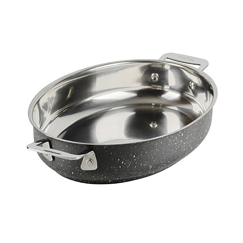 This oval au gratin dish from Bon Chef is perfect for banquet or buffet presentations. It can be used in steam tables, on induction stoves and be placed in ovens, up to 400°F. This dish features durable stainless steel construction with two handles and is great for display cooking.