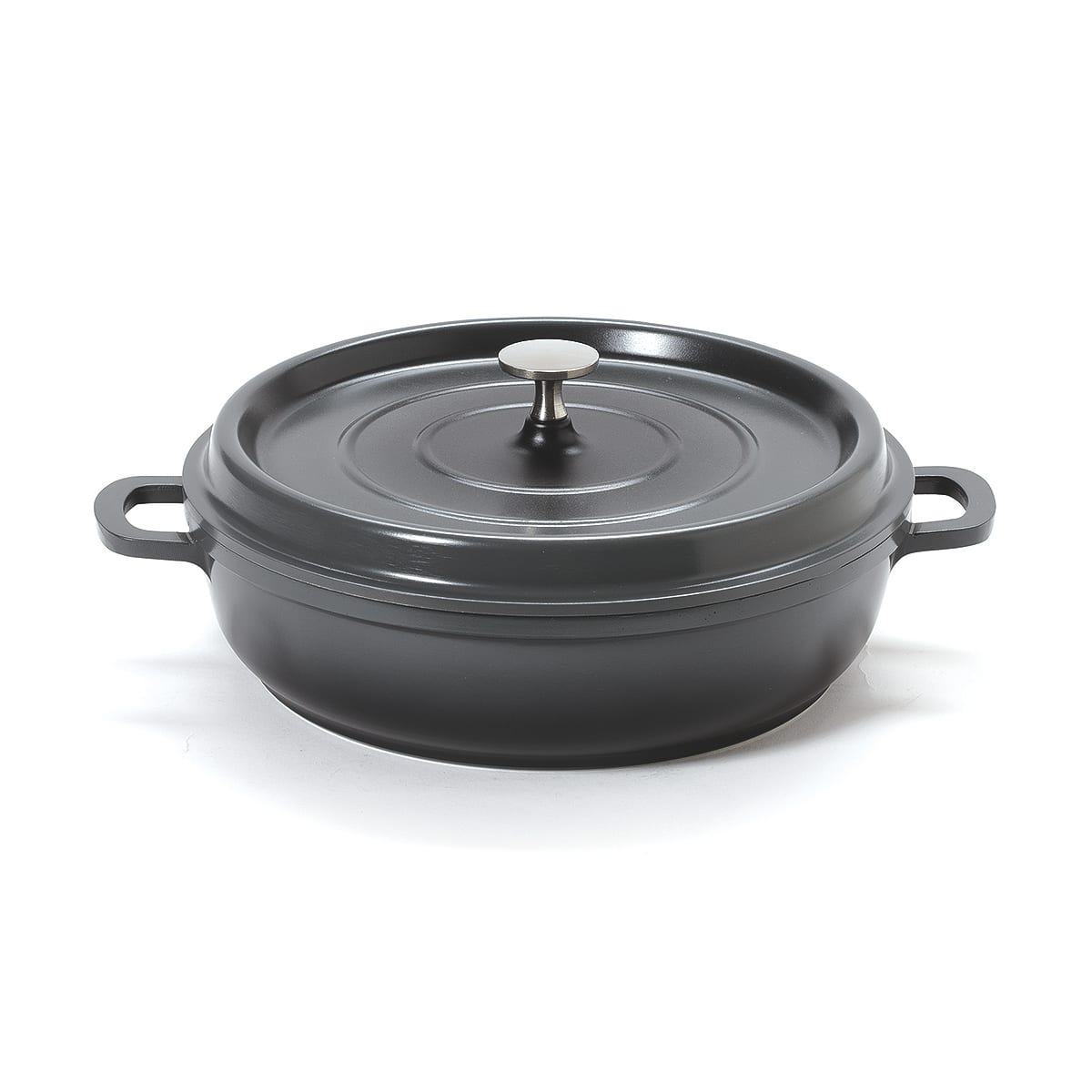 This 3 quart braiser from G.E.T. Enterprises features cast aluminum construction with an induction base and a ceramic enamel coating that offers even‐heating throughout interior.