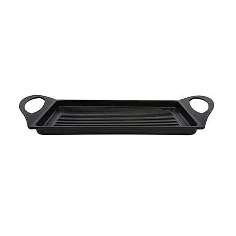 Suitable for stove top, hot plate, induction‐ready and oven‐safe, this grill pan from TableCraft has an exterior coating that is designed for exposure to high temperature and features a non‐stick interior and strong cast handles.
