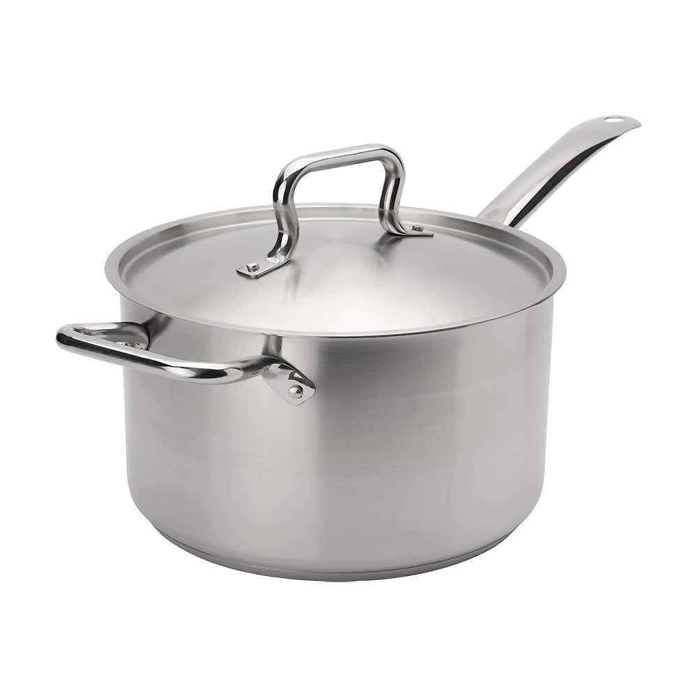 This stainless steel sauce pan from Browne Foodservice is part of the Elements Collection and features a 4mm Tri-Ply base that allows for even heat distribution. It is crafted with precision and will elevate your cooking experience to new heights!