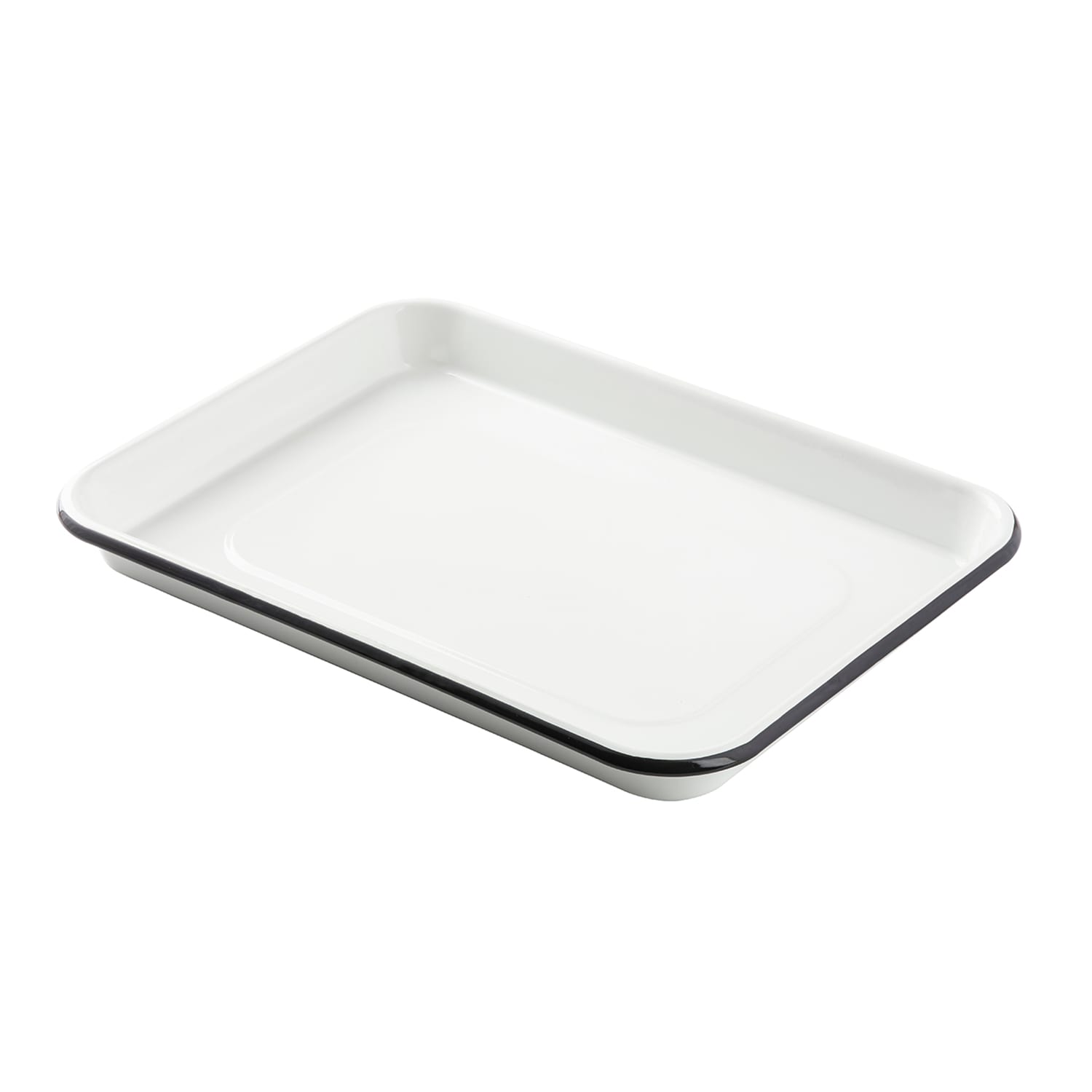 The 1/4 size sheet pan server from TableCraft is part of the Enamelware Collection™ and adds a unique farm-to-table look to any table setting. The vitreous porcelain enamel coated steel offers a durable, dishwasher and heat safe serving option.