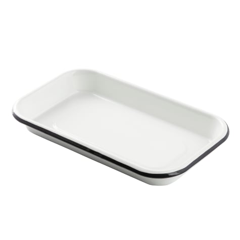 The 1/8 size sheet pan server from TableCraft is part of the Enamelware Collection™ and adds a unique farm-to-table look to any table setting. The vitreous porcelain enamel coated steel offers a durable, dishwasher and heat safe serving option.