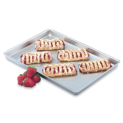 This Vollrath Wear‐Ever aluminum party pan is made using impact‐resistant 3004‐Series aluminum to be durable and last for years. The smooth interior ensures even heating and great results and the beaded edges not only add durability and provide a secure grip, but keep items in place. Great for brownies, cookies, jelly rolls and more.