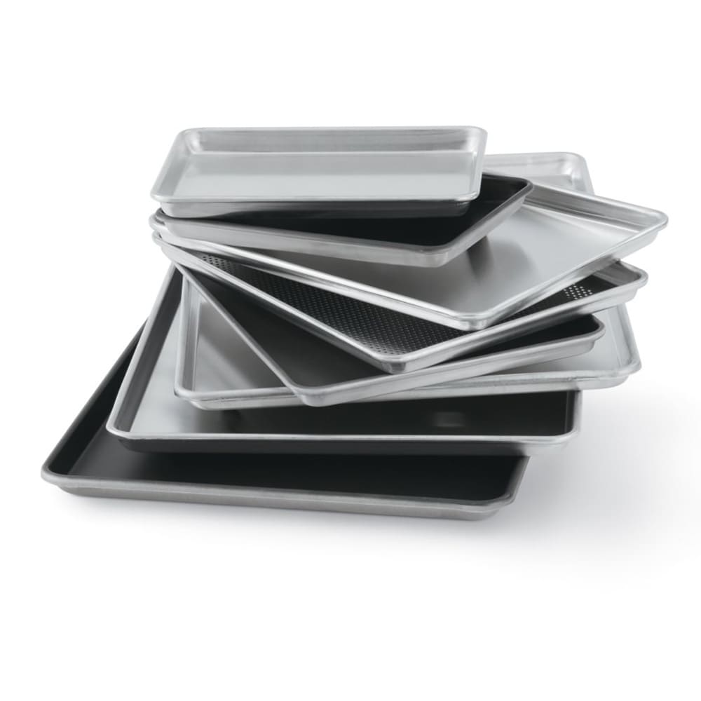 Made of heavy-duty 18-gauge aluminum, the Vollrath® Wear-Ever sheet pan is proven to be 20% stronger than the competition. It heats up and cools down quickly, and the pan's concave bottom flattens for even heating. The natural finish ensures uniform results, and the tapered sides allow for convenient stacking. Featuring an aluminum reinforcing bead construction that is fully-encapsulated, this sheet pan offers an exceptional NSF-approved seal that prevents rust and adds strength without adding weight.