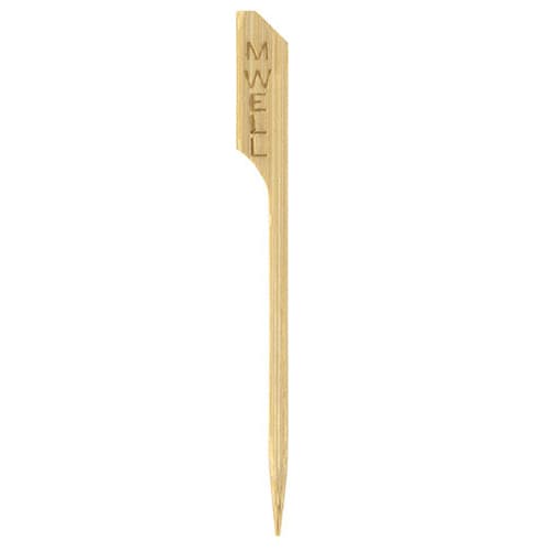 This 3.5" bamboo "Medium Well" meat marker pick from Front Of The House® allows you to easily identify the doneness of the meat.