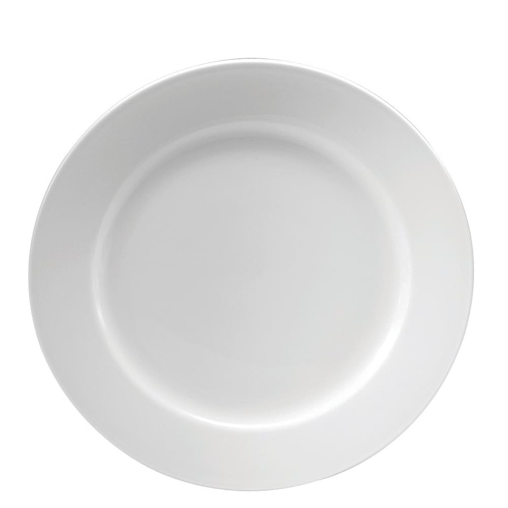 Serve appetizers or small entrees on this 9.5" round plate from 1880 Hospitality. It is part of the Royale Collection and features beautiful bright white porcelain and a flat mid‐rim design. Perfect for banquet operations