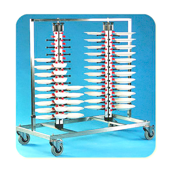 This mobile plate rack from Plate-Mate is designed for banquet facilities, healthcare centers, and catering operations. With a capacity to securely hold 96 fully or partially finished plates, this stainless steel rack optimizes space and efficiency. The columns on this 96 plate mobile plate rack can turn independently of each other in the frame, full of plates, with a diameter of up to 12.9" (33 cm). The solid stainless steel construction means this mobile plate tree will never rust and clean up is a breeze. The frame sits on swivel wheels with brakes on two of them. This rack adjusts to fit nearly any plate size. If used properly you can tilt the dish racks up to a 20 degree angle, fully loaded, without dropping any of the 96 plates.