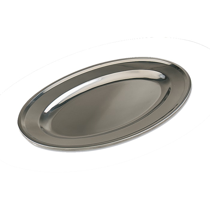 This beautiful oval platter from Browne Foodservice features stainless steel construction with a mirror finish and rolled edges.