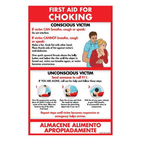 This 11" x 17" First Aid for Choking Poster features easy to follow instructions and is perfect for restaurants, cafeterias, schools and break rooms.