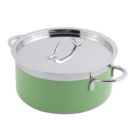 This 4 quart lime green French Pot from Bon Chef is part of the Classic Country French Collection and combines an attractive design with functional construction for the ultimate line of efficient, easy to use cookware. It interweaves 5 layers of highly conductive aluminum and stainless steel for optimal even heat distribution. This pot is induction‐ready and works with your induction stoves for fast, even heating. It is also ideal for steam tables and cold wells.