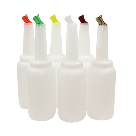 This 1/2 gallon Pourmaster Complete Bottle from TableCraft includes a container, easy grip neck with snap‐tight pourer and cap for easy storage.