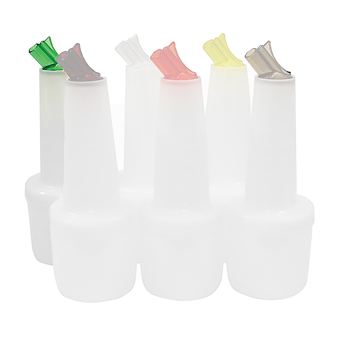 Easy‐pour natural bottle with clog‐resistant green spout for mixers and juices. Color‐coded cap for easy identification and quick selection at busy times. Complete set includes: container, easy grip neck with snap‐tight color pourer and a color‐coded cap for easy storage.
