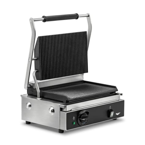 For little change to your panini sandwich, choose this Vollrath "groovy" panini sandwich grill. It may be small in size, but it will get the job done. This single panini press can make everything from Italian sandwiches to burgers and give you the perfect grill marks you want. The heavy‐duty cast‐iron plates provide superior heat retention and the pivot‐action top plate that adjusts to food thickness.