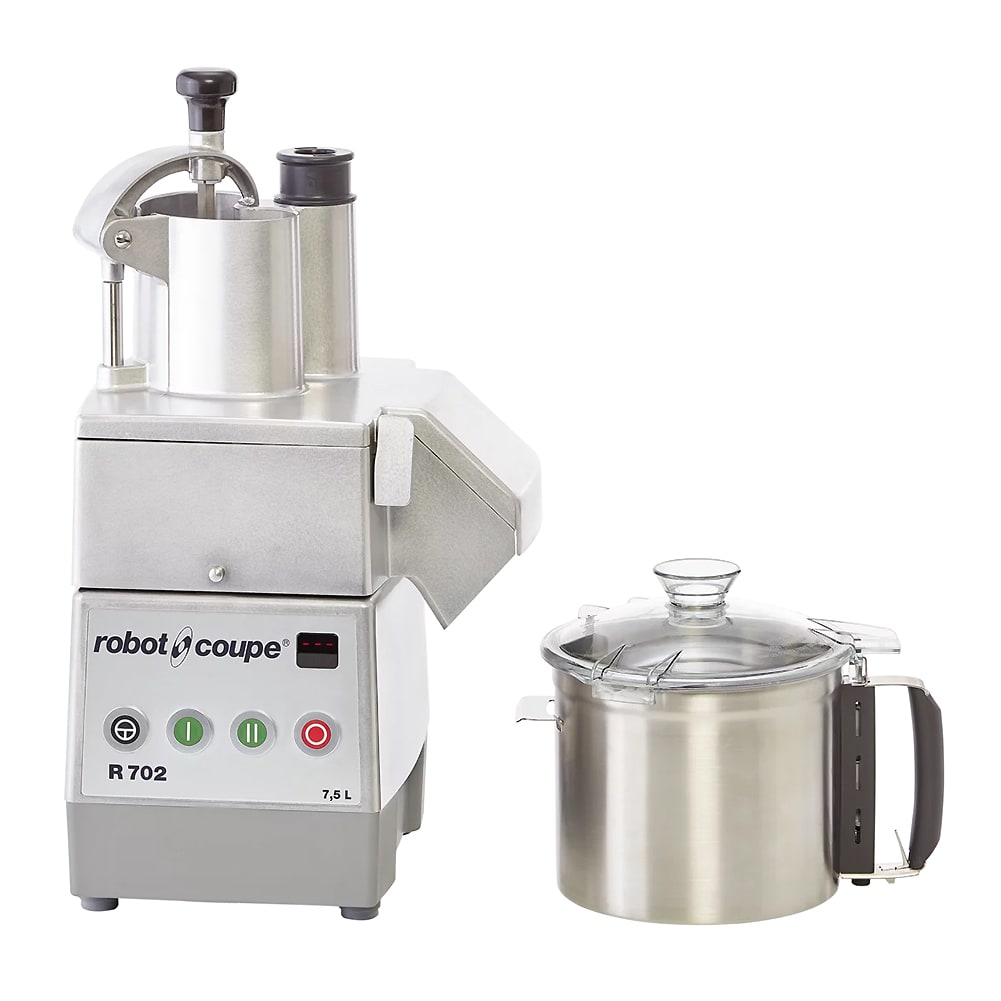 The Robot Coupe R702 food processor provides efficient processing of vegetables such as cabbage, carrots, or potatoes. The Exactitube pusher features diameter adjustment that allows for the precise cutting of larger or smaller ingredients with ease. The cylindrical hopper is designed for handling long or delicate vegetables. With two hoppers, this prep machine provides the versatility and precision you need for a variety of ingredient.