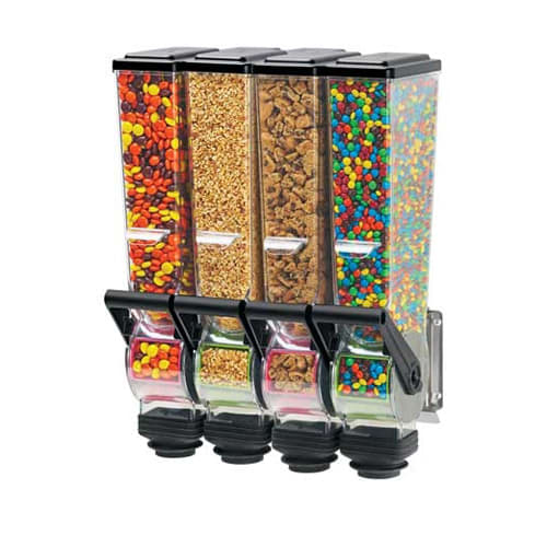SlimLine™ dry food and candy dispensers can serve portions of toppings, even in small spaces. The lightweight, 13" brackets mount to any vertical surface and can be placed side‐by‐side. Not recommended for powders or sticky products such as crushed candy bars.