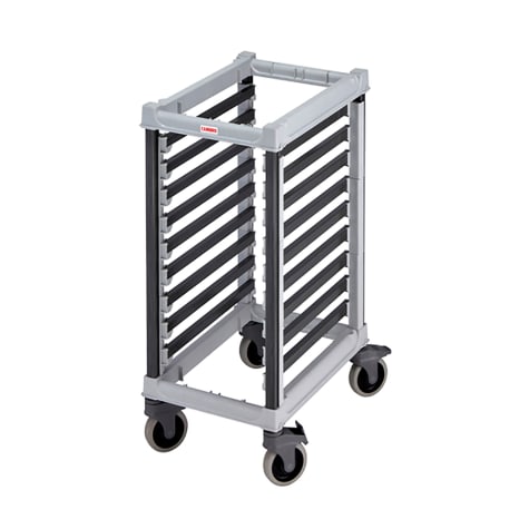 The Camshelving GN 1/1 and GN 2/1 food pan trolley is made of a composite material that is stronger than steel, but without the failing weld points, and resists rust and corrosion and eliminates the noise and wear of metal on metal. The sleek design presents well for front or back of house use. It carries standard Gastronorm food pans. The wide 3" rail spacing offers the greatest versatility and ease of use, with 0.12" pan stops at each end of the rails to provide stability.