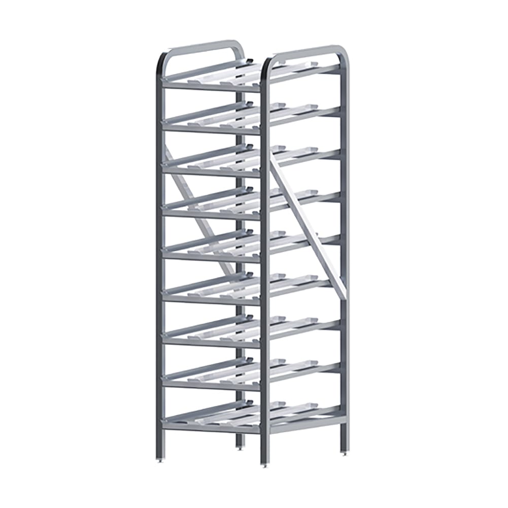 This can rack from Winco is designed with angled shelves for first-in first-out stock rotation. This rack has 9 tiers and is designed to hold up to (162) #10 or (216) #5 cans.