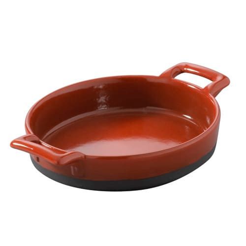 This Revol® USA Eclipse Creme Brulee Dish has a 5.25 Oz. capacity and is made from porcelain. It has a red glaze over two-thirds of its body. This dish is oven safe to 572°F, and is also microwave, freezer, and dishwasher safe.