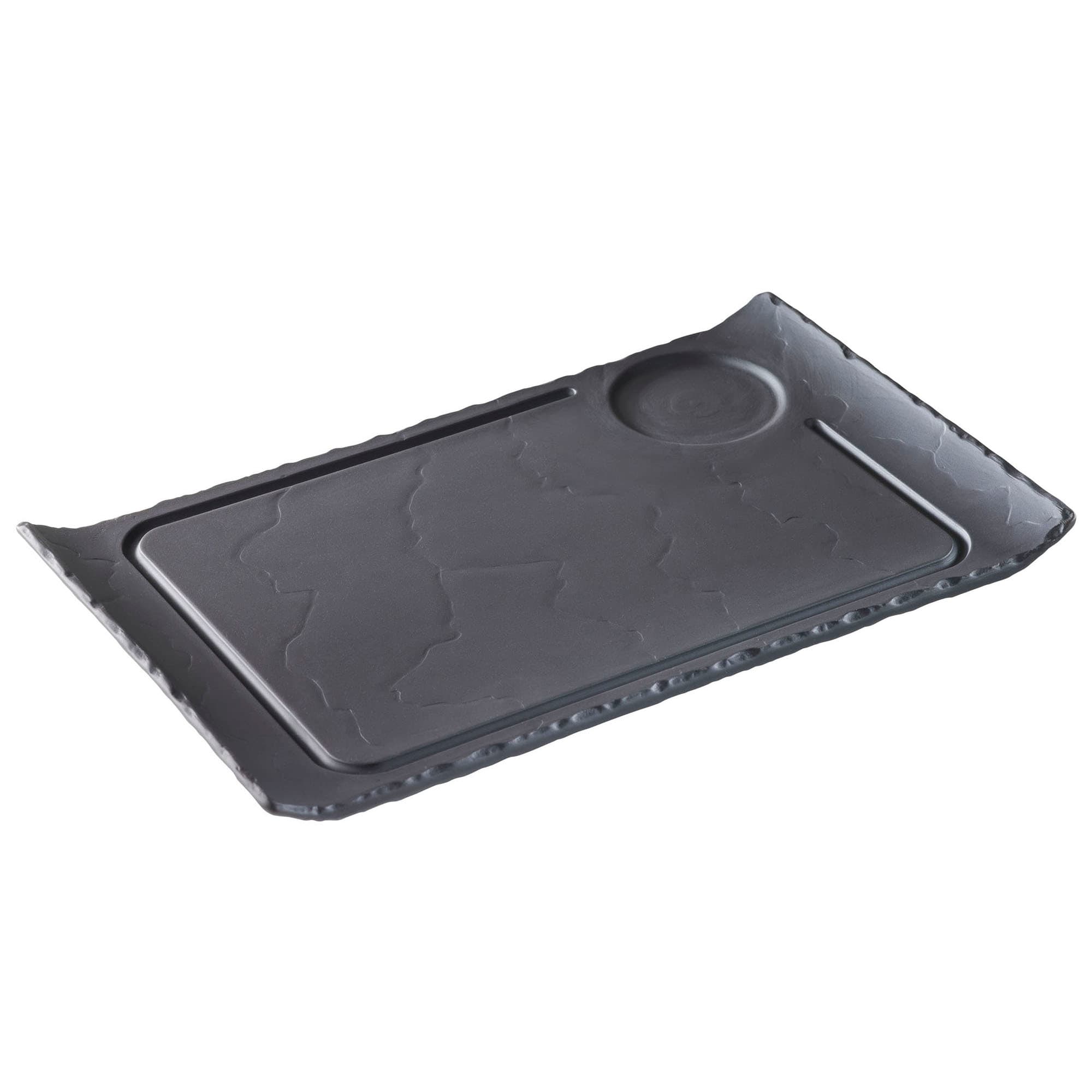 This Revol® USA Basalt Steak Plate comes in a 13" x 7.75" size and has a 2.25" diameter well for sauces, condiments, and more. It is made from ceramic and is 100% food safe.