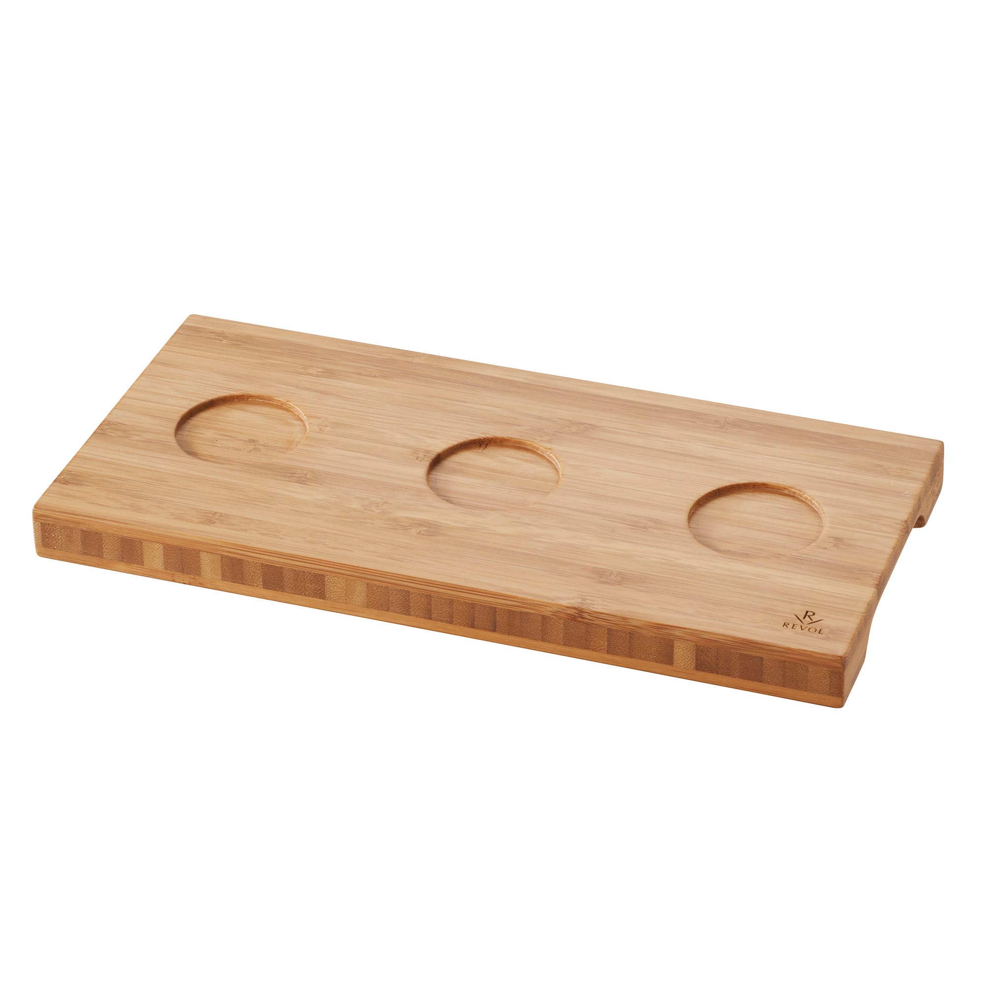 This bamboo tray from Revol USA is 9-3/4 x 4-3/4" and is part of the Touch Collection. This tray features three