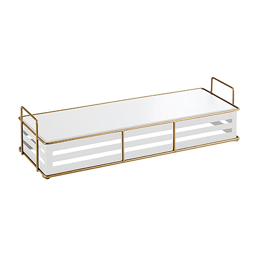 The Empire Rectangle Riser from Cal-Mil features a sleek white base that utilizes rectangle cutouts to add an extra touch of detail. The gold frame on this 20.5 x 7 x 5.25" riser provides extra rigidity while maintaining a classy appearance.