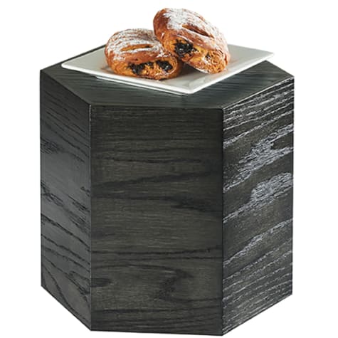 This Cinderwood Hex agon Riser from Cal‐Mil features an elegant dark‐stained oak finish and is perfect for displaying appetizers, desserts and other delicious foods.