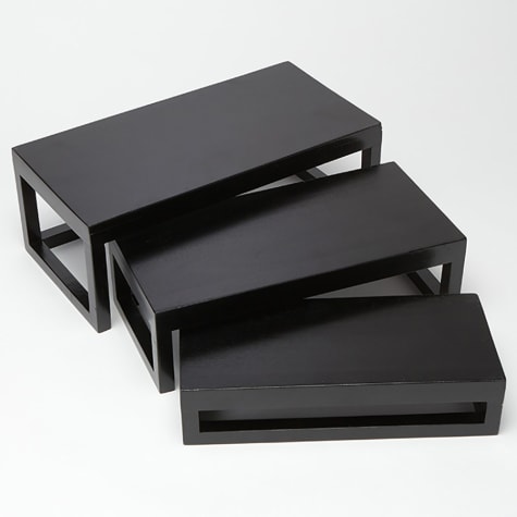 This 3-piece wooden riser set from American Metalcraft features black lacquered wood in a solid frame that works well in any buffet or banquet setting.