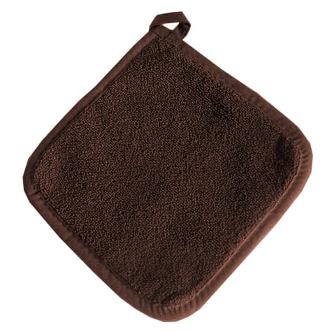 This Darling Foodservice Pot Holder includes a hanging loop and is made from 100% terry cotton. It features a mocha color and is 8.25" x 8.5".