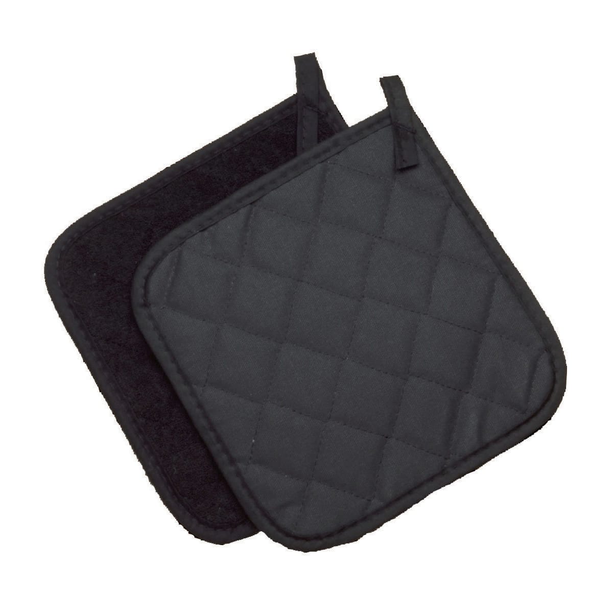 This 8" x 8" flame-resistant pot holder from Chef Revival® features Pyrotex® fabric on one side and 100% terry cotton on the other. This black pot holder is lab tested to 450°F and is perfect for any kitchen!