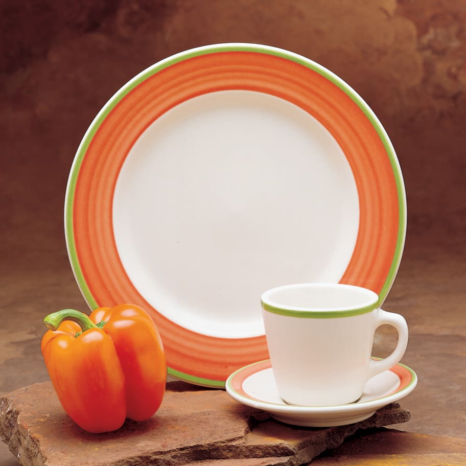 This 11‐1/8" plate features an ivory body and a heavy duty rolled edge and the orange and green bands of the Riviera Toulon pattern.