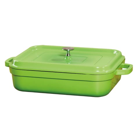 This Heiss™ Induction Ready Rectangular Roaster from G.E.T. features cast aluminum material with an induction base and ceramic enamel coating. It is heat resistant up to 500°F and is dishwasher safe for easy cleaning.