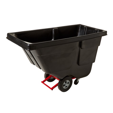 This black utility duty .5 cubic yard tilt truck features industrial‐strength, rotational molded construction that lets you move heavy loads with ease. Its smooth surface resists corrosion and is easy to clean, and the constant force design allows for controlled dumping by just one person. It also has a 4" center swivel caster for better maneuverability and 10" inset big wheels that can handle uneven terrain while also protecting walls and fixtures. To keep the contents of this truck concealed without losing capacity, you can use the 1307 domed hinged lid.