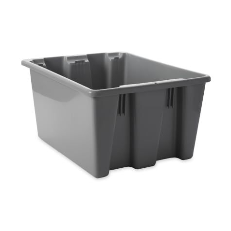 This gray 1.3 cubic foot Palletote storage box is a durable, cost‐effective means of storage and transport. It nests and stacks neatly to fit six units per level onto 40" and 48" pallets, plus it includes a 180° stacking feature for greater stability. The high‐density polyethylene construction of this box won't rust, chip, dent or peel, is highly resistant to stress cracks, and also withstands temperatures from ‐10° F to 130°F. For extra security, a matching snap‐on lid is available.