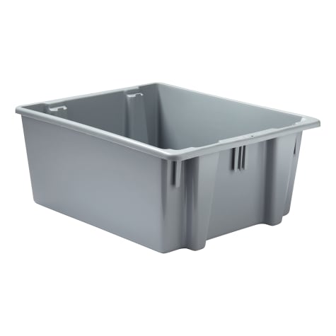 This gray 2 cubic foot Palletote storage box is a durable, cost‐effective means of storage and transport. It nests and stacks neatly to fit six units per level onto 40" and 48" pallets, plus it includes a 180° stacking feature for greater stability. The high‐density polyethylene construction of this box won't rust, chip, dent or peel, is highly resistant to stress cracks, and also withstands temperatures from ‐10° F to 130°F. For extra security, a matching snap‐on lid is available.