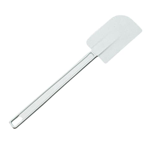 This white 9.5" rubber scraper features a traditional‐style flat rubber blade and sturdy polypropylene handle, plus seamless construction that resists dirt and bacteria buildup and is dishwasher safe. The blade is molded onto the handle for a permanent bond, ensuring long product usage life.