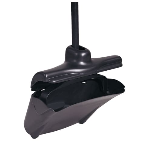 This black upright dustpan with self‐opening and closing cover features rear wheels that improve wear resistance and a sturdy plastic body that will not stain, discolor or absorb odors. It is ideal for use in malls, restaurants, lobbies and other areas with regular traffic.