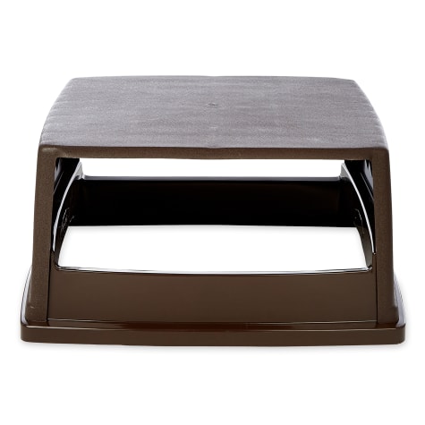 This brown hooded top without doors fits 256B Glutton 56 gallon containers and provides extra protection from rain and wind, helping keep trash from getting moldy or blowing away.