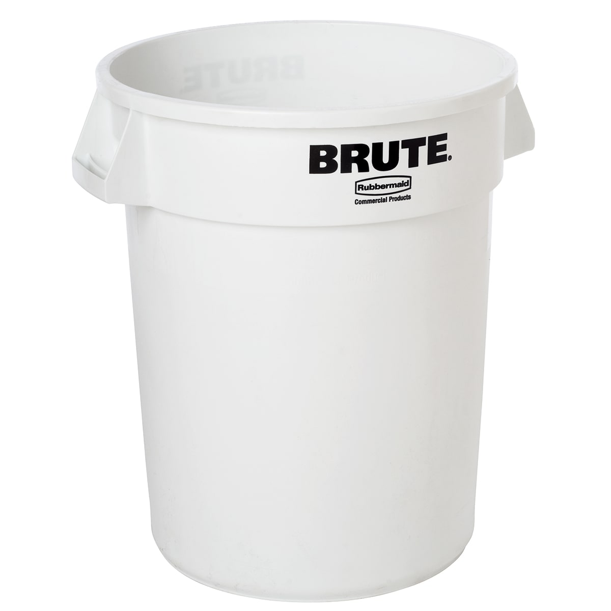 This white 32 gallon container without lid features the renowned durability of the BRUTE™ line, with all‐plastic professional‐grade construction that will not rust, chip, peel and resists dents. It has reinforced rims for added strength, built‐in handles that make carrying easy and prevent jamming when nesting, and a double‐ribbed base that increases stability and dragging capacity. No container is more versatile. There are a variety of lids for this Rubbermaid 32 gallon Brute container: 1788376 and 1788377 bottle/can recycling lids, 1788378 and 1788379 paper recycling lid, 1788380 and 1788471 single stream recycling lids, 2631 flat lid, 2637-88 dome top lid, and 3443 funnel top lid.