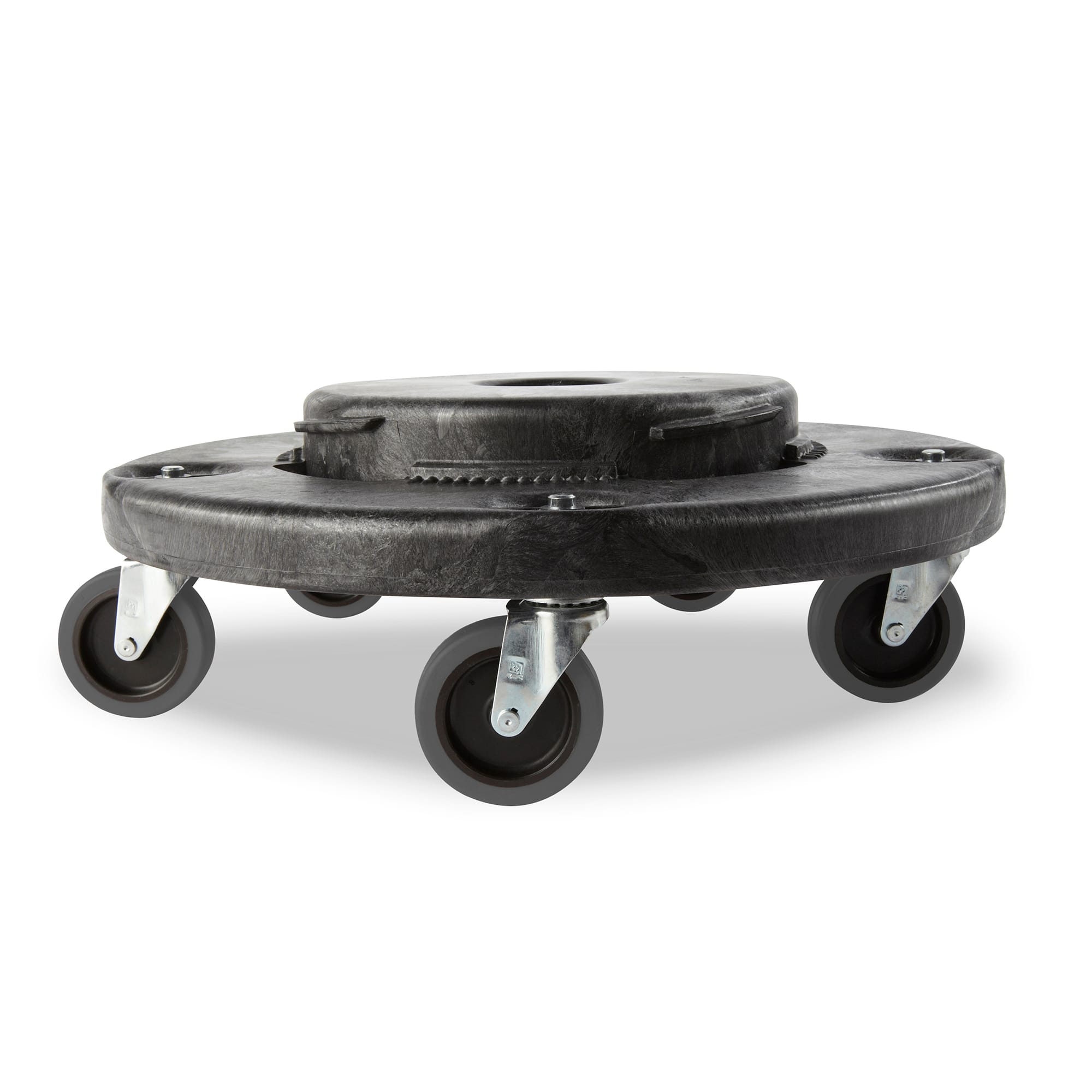 This round black dolly is the easiest way to transport your BRUTE™ containers from 20 gallon to 55 gallon in size, holding up to 250 lbs. at one time. The all‐plastic construction resists rusting, chipping and denting, and the non‐marking red casters eliminate 88% of traditional dolly noise across all kinds of surfaces, as well as make it easy to distinguish the dolly at a glance from other, normal dollies