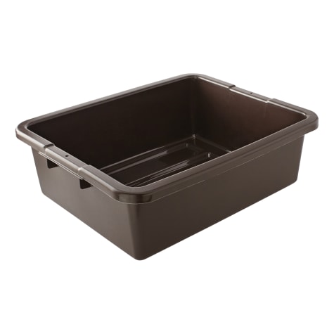 This brown 7.6 gallon bus tub / utility box with one section is made of durable polyethylene that is commercial dishwasher safe. It has rounded corners for easy cleaning and reinforced handles, bottom and ribs for added strength.