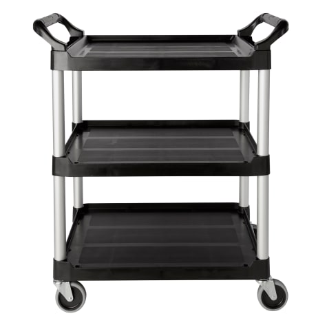 This black 3‐shelf utility cart features sturdy, lightweight plastic shelves that are smooth, easy to clean and help eliminate noise, plus brushed aluminum uprights that give the cart a stylish appearance. Its large, 4" non‐marking swivel casters are gentle on your floor, and the top shelf has easy to grip handles at both ends for better maneuverability.