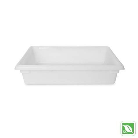 This white 8.5 gallon food and tote box is a convenient way to maximize storage space while reducing food spoilage costs. Its white polyethylene construction is durable and economical, as well as dishwasher and freezer safe. Use with tight‐fitting snap‐on lid (sold separately) to keep food fresh, and space is provided on both the box and lid for date control labels.