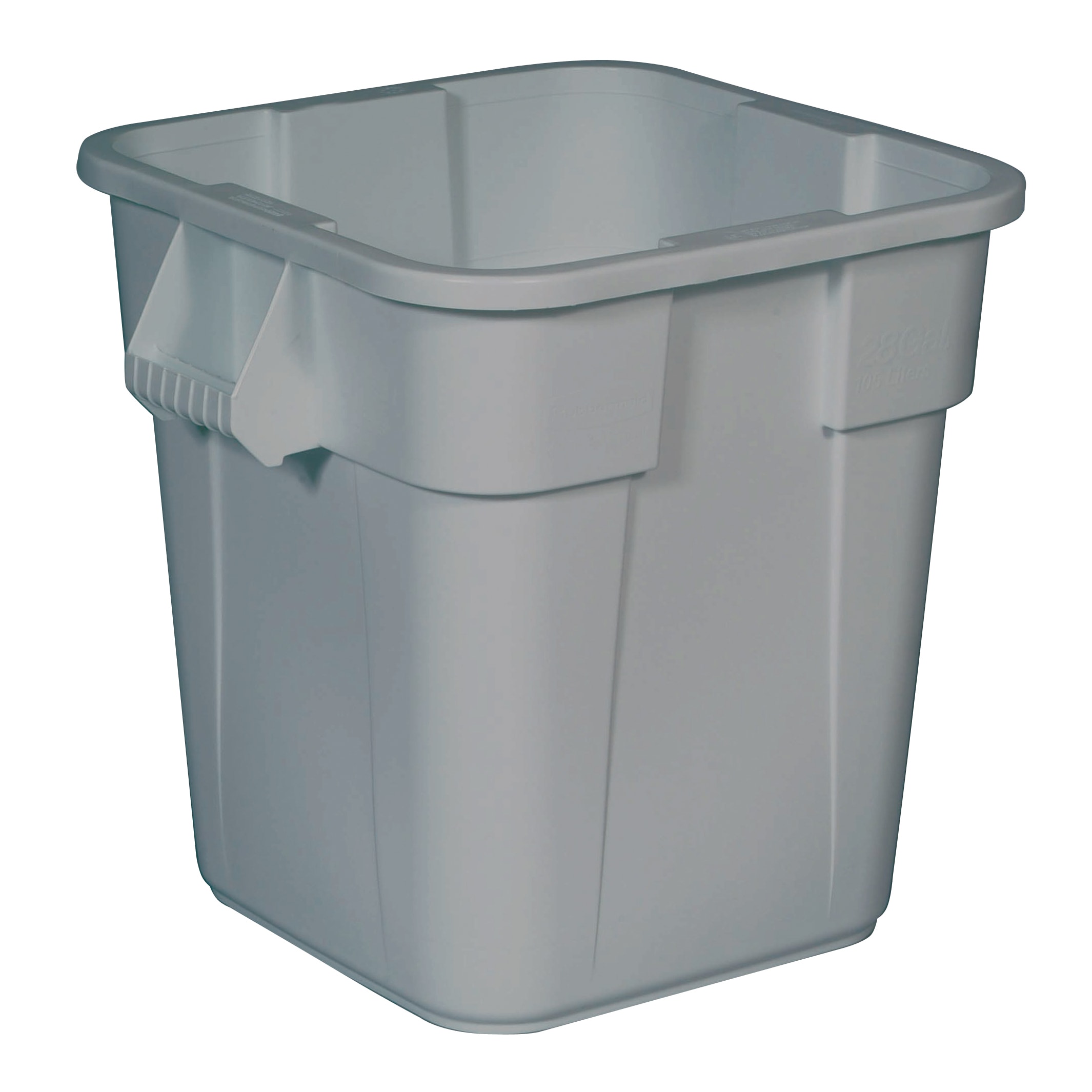 This gray 28 gallon container without lid features the renowned durability of the BRUTE™ line, with all‐plastic professional‐grade construction that will not rust, chip, peel and resists dents. Its square shape offers up to 14% more capacity than similarly sized round containers, and its rounded corners and smooth contours are easy to clean. It also has built‐in, nesting handles that make carrying easy and fit securely together for side‐by‐side use. No container is more versatile.