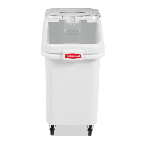 This white mobile ingredient bin has a max capacity of 3.5 cubic feet and features a slanted sliding lid for one‐handed access with a clear door and ingredient labels for easy content identification. It also has a unique, built‐in hanging hook that lets you store the included 32 oz. scoop inside the bin while keeping the scoop out of the food itself ‐ no other ingredient bin design prevents cross‐contamination and complies with FDA food safety regulations like this one. This bin's industrial‐grade plastic construction is smooth and easy to clean, and its rectangular shape gives you optimal storage space while still fitting neatly underneath tables and in storerooms.